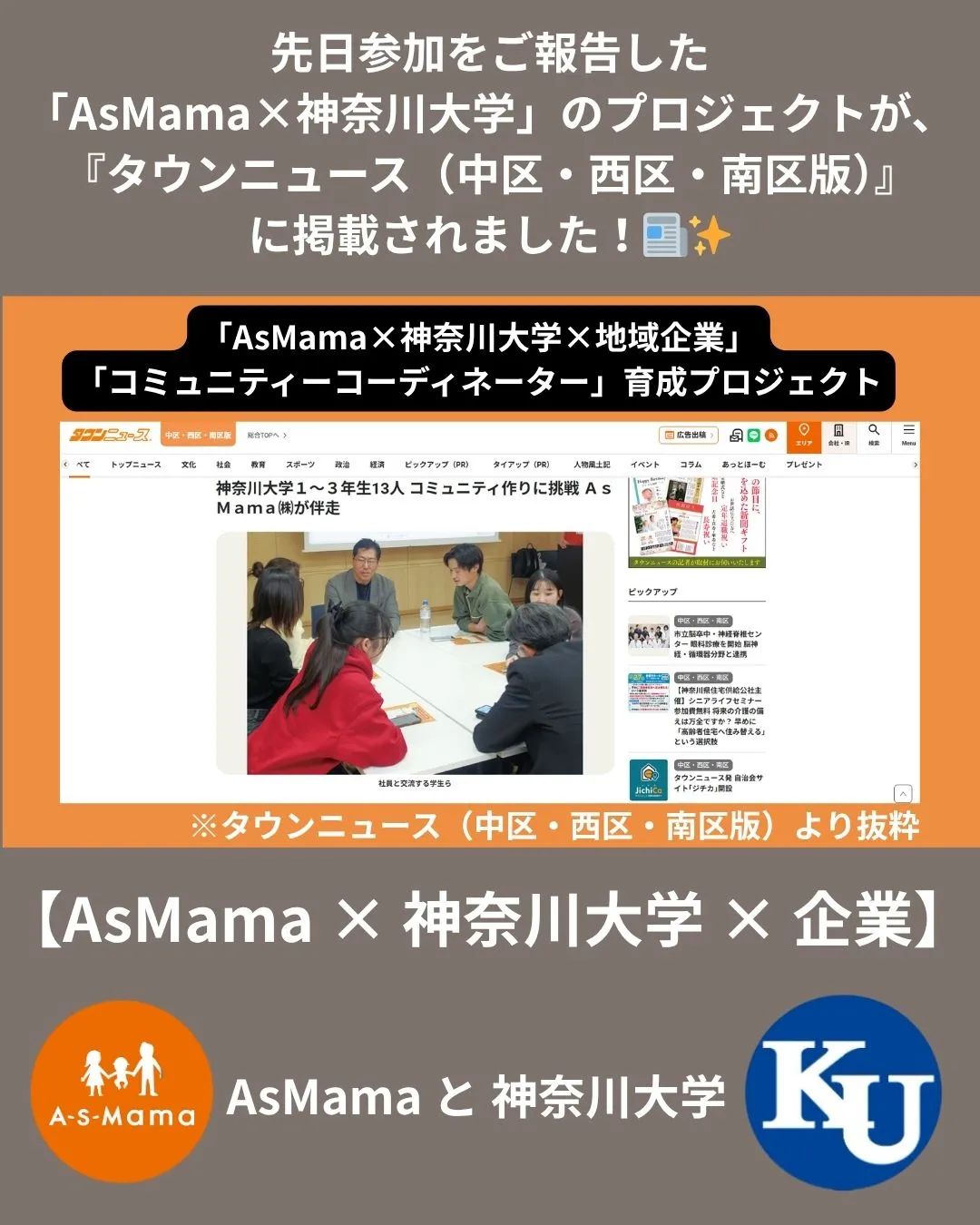 先日参加をご報告した「AsMama×神奈川大学」のプロジェクトが、なんと『タウンニュース(中区・西区・南区版)』に掲載されました!📰✨